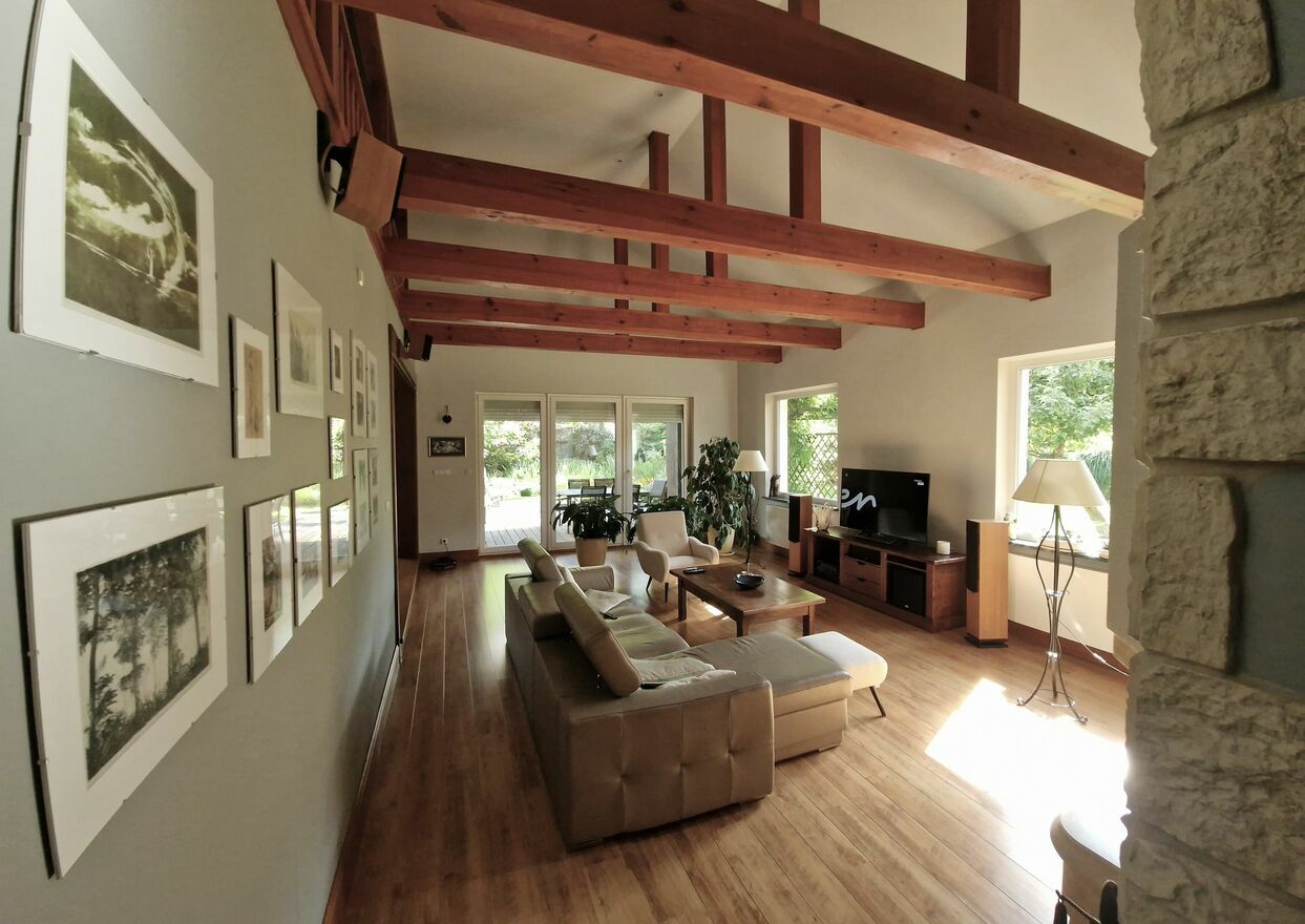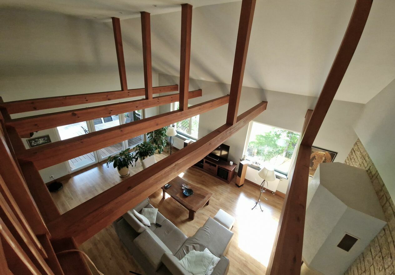 Dom bardzo zadbany z otwartą częścią salonu na jadalnię oraz antresolę. Dodatkowo przed salonem zadaszony taras oraz wyjście na ogród.