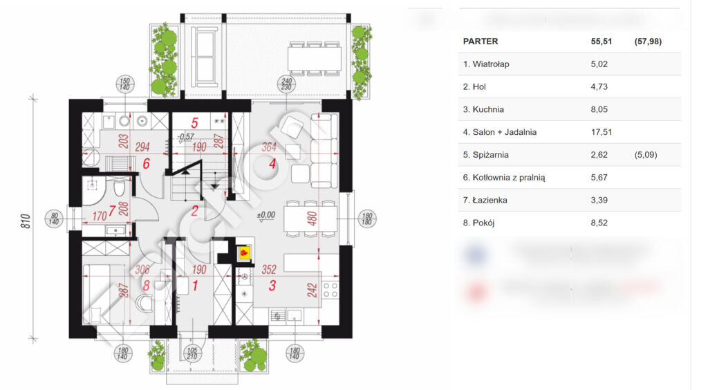1. Parter: wiatrołap/5.02m2/, hol/4.73m2/, kuchnia/8.05m2/, salon+