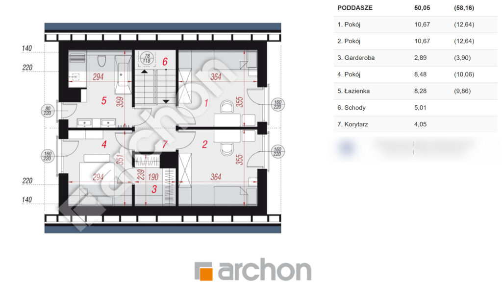 2. Poddasze: korytarz/4.05m2/, pokój/10.67m2/, pokój/10.67m2/,