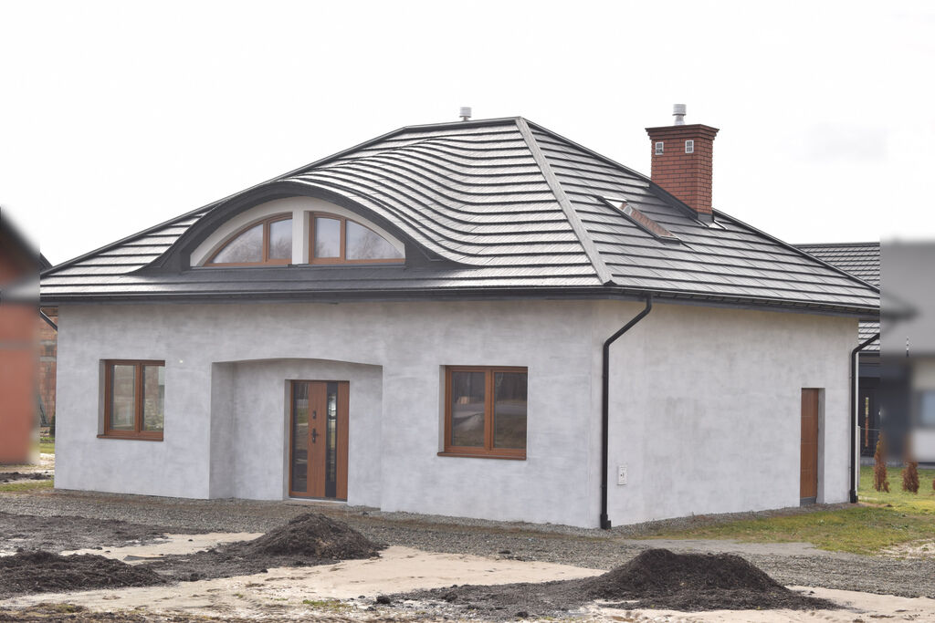 wielospadowy pokryty blachodachówką w kolorze grafitowym typu gont,